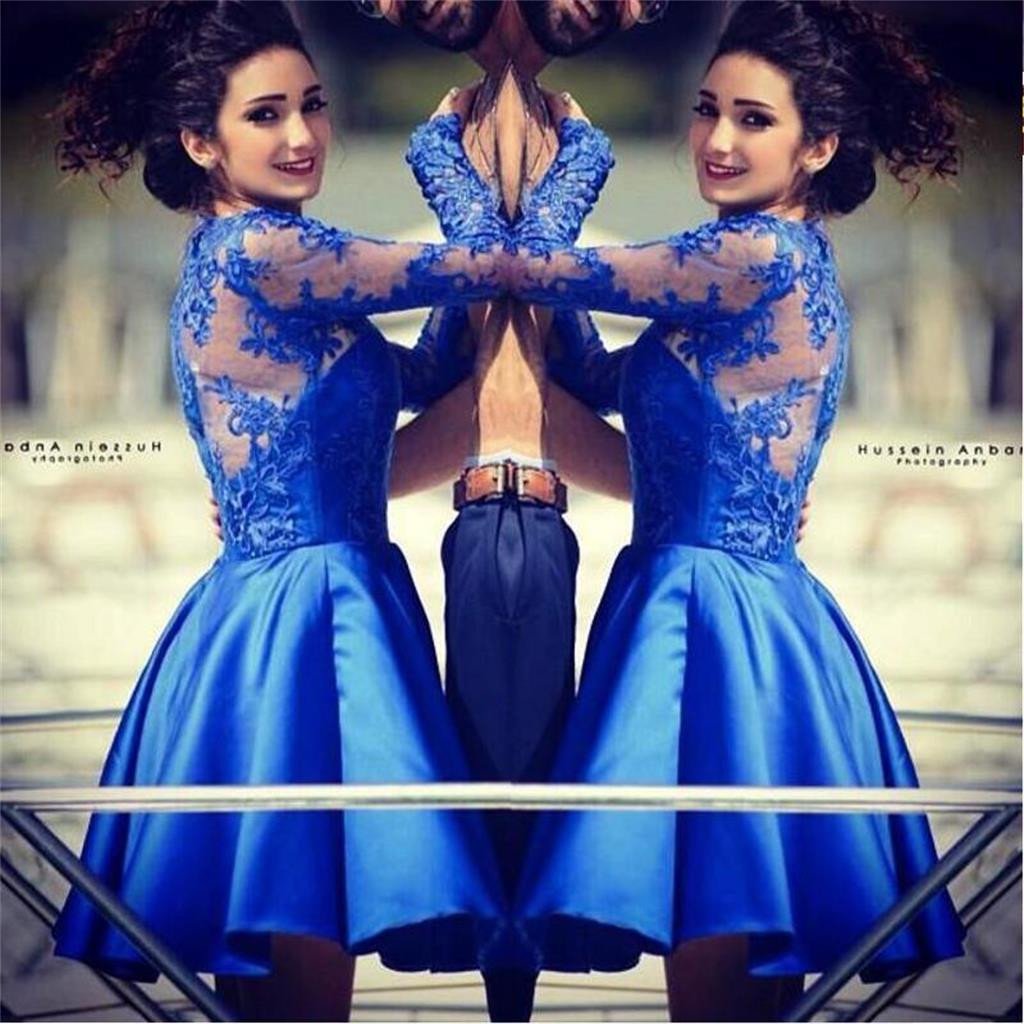 Blue lace long sleeves most popular junior homecoming dresses for teen , BD00199