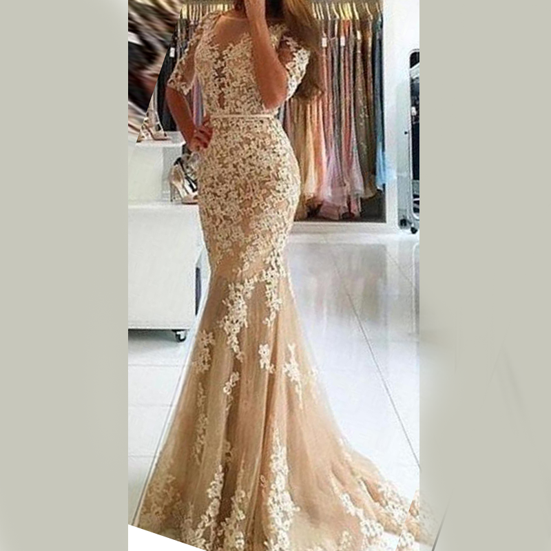 Half-sleeve Lace Appliques Mermaid Sexy Long Prom Dress, PD3083
