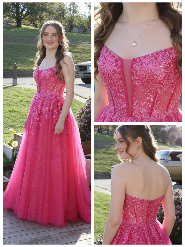 Hot Pink Strapless Lace Sequin Tulle Ball Gown, Formal Prom Dress with Boning, PD4136