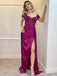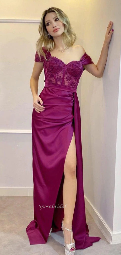 Mulberry Off-shoulder Sexy Lace Top Side-slit Mermaid Long Prom Dress, PD3534