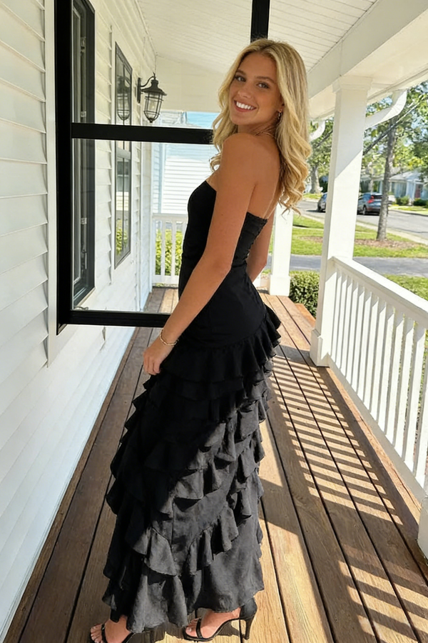 Sexy Black Chiffon Strapless Side Slit Mermaid Ruffle Prom Dress, PD4132