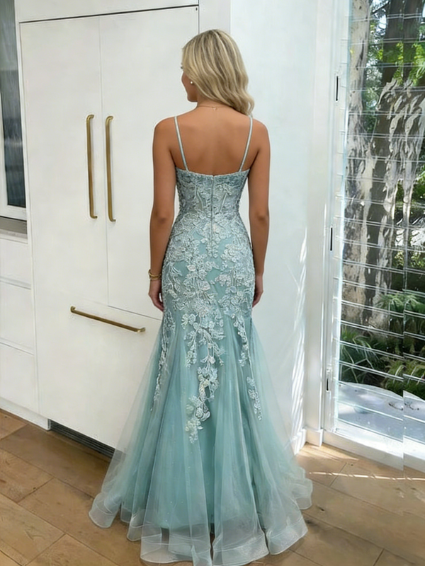Sexy Tulle Spaghetti Straps V-Neck Lace Appliques Mermaid Floor Length Prom Dress, PD4120