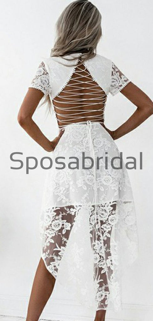 A-Line V-Neck Short Sleeves White Lace Hi-Lo Homecoming Dresses BD0437