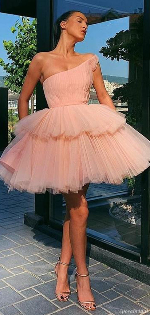 Elegant Pink Ballet One-shoulder Ruffle Short A-line Homecoming Dress, Graduation Dress, HD3071