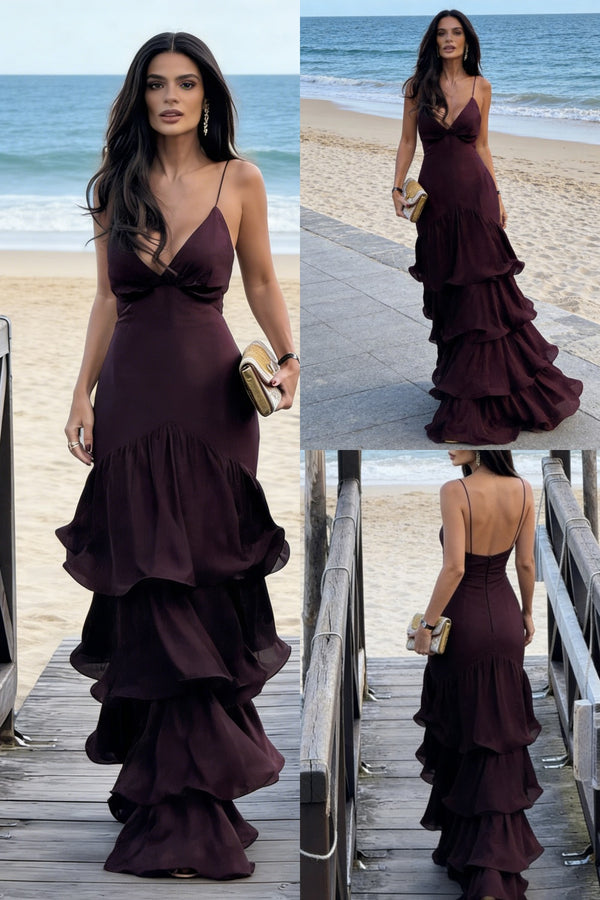 Plum Deep V Spaghetti Strap Tiered Ruffled Backless Maxi Dress – Beach Formal Evening Gown, PD4168