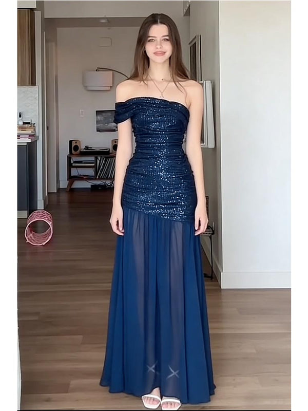 Romantic Navy Blue One Shoulder Sequin Chiffon Evening Gown